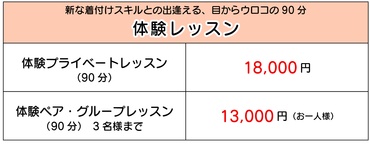※単発でのペアレッスンの一回料金は12,000円(お一人様)となります(レッスン時間が30分増えます)。